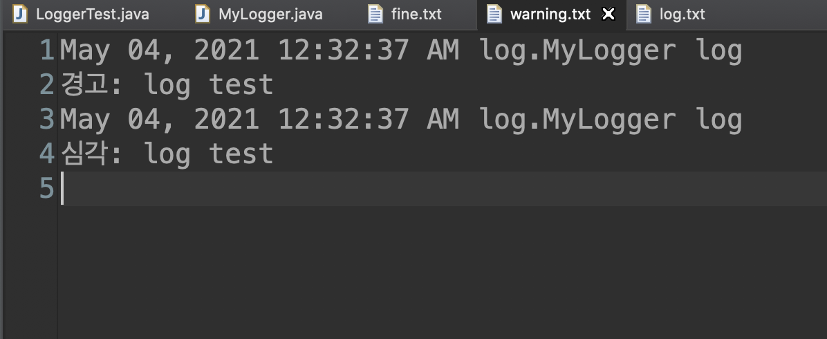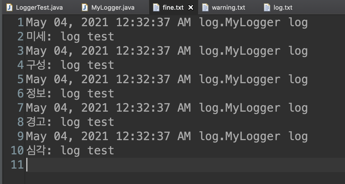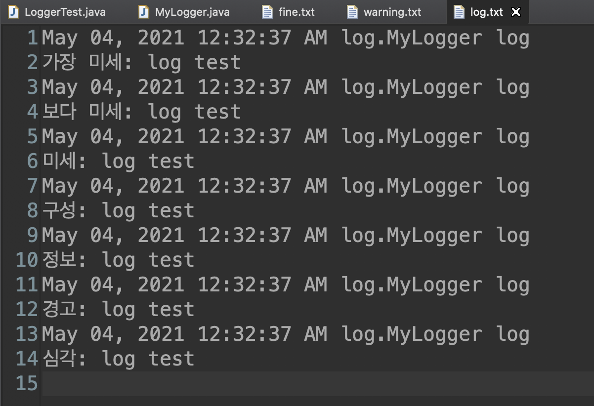 확인해보면 각 파일의 로그 레벨을 모두 다르게 설정해놓았는데 log.txt는 ALL로 설정해 놓았기 때문에 모든 레벨의 로그가 모두 찍혔고, warning.txt는 warning, severe 레벨의 로그만, fine.txt는 fine, config, info, warning, severe까지 5개의 레벨 로그가 찍혀 있다.