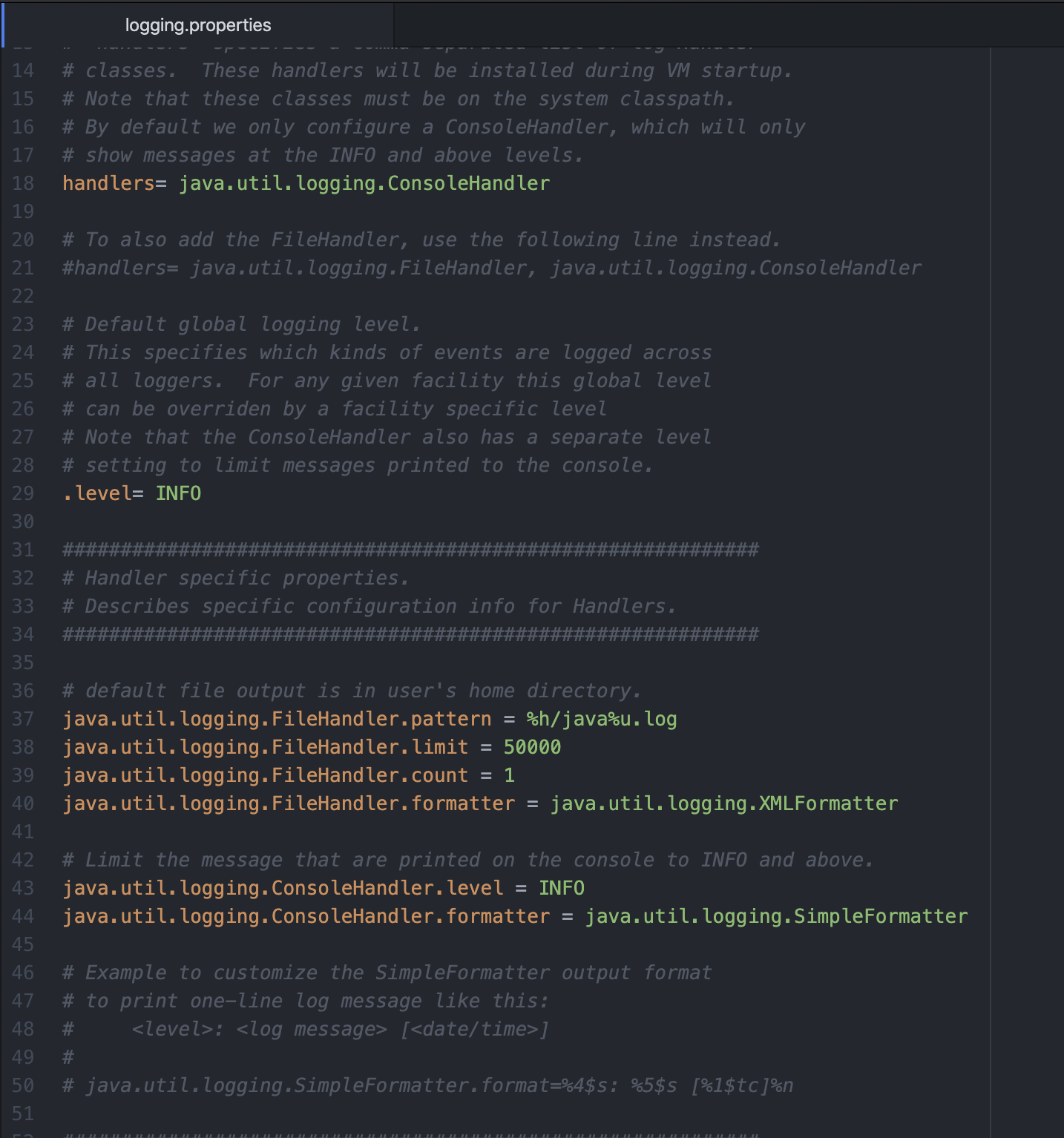 logging.properties Java가 설치된 디렉토리에서 jdk*(버전)/Contents/Home/jre/lib/logging.properties에 가보면 이를 확인할 수 있는데, 위 사진에서 43 라인에 INFO로 설정되어 있음을 알 수 있다. 변경해서 쓸 수도 있다.