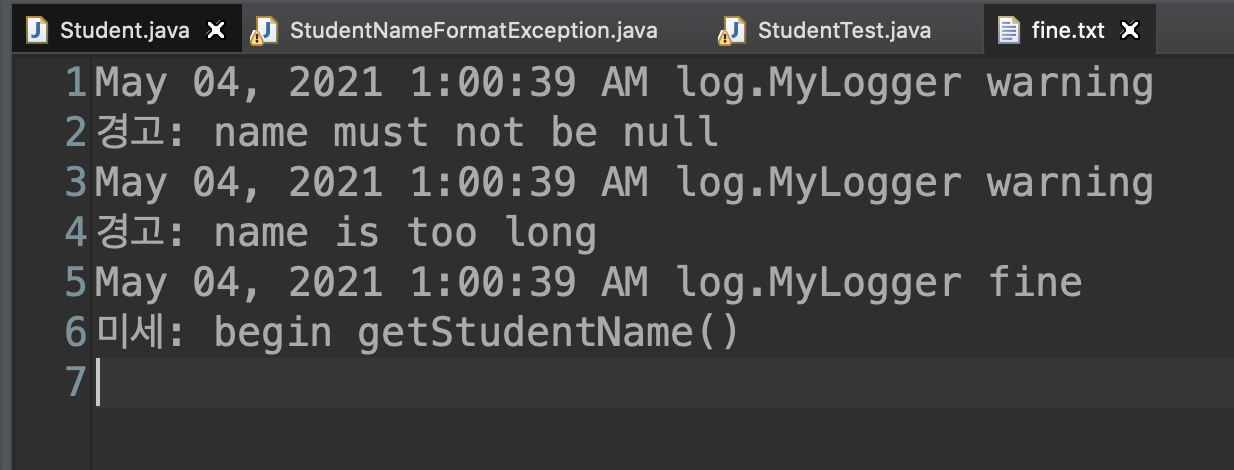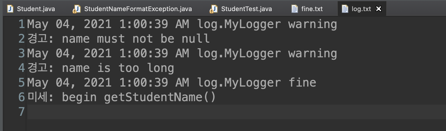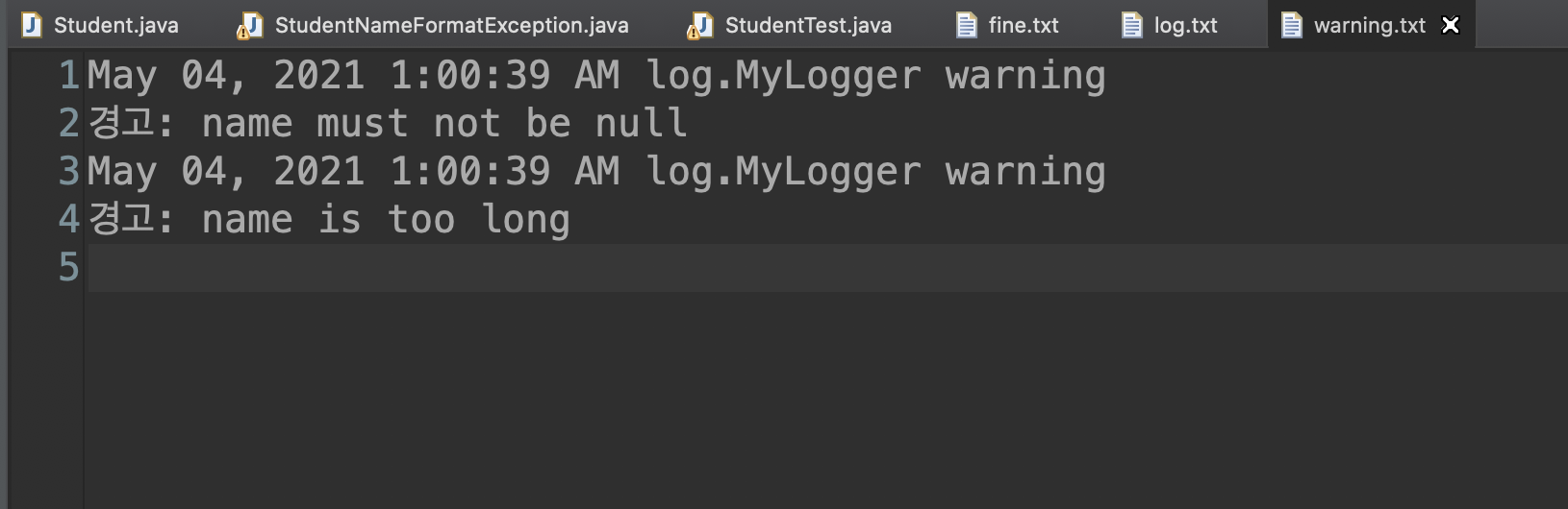 package log; public class StudentTest { public static void main(String[] args) { MyLogger myLogger = MyLogger.getLogger(); String name = null; try { Student student = new Student(name); }catch(StudentNameFormatException e) { myLogger.warning(e.getMessage()); } try { Student student = new Student("Edward Jon Kim Test"); }catch(StudentNameFormatException e) { myLogger.warning(e.getMessage()); } Student student = new Student("James"); name = student.getStudentName(); } }Test에서 첫 번째 student는 name이 null이기 때문에 "name must not be null" 에러 로그가 발생하고, 두 번째 student는 name이 공백 3개 이상이기 때문에 "name is too long" 에러 로그가 발생할 것이다. 세 번째 student는 문제 없이 잘 생성될 것이고, 마지막 name = student.getStudentName() 메서드는 fine로그를 지정해두었기 때문에 해당 로그가 예상된다.