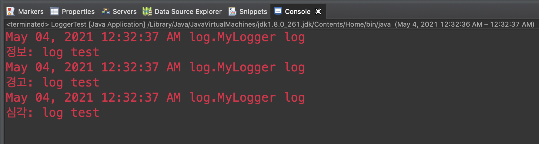 package log; public class LoggerTest { public static void main(String[] args) { MyLogger logger = MyLogger.getLogger(); logger.log("log test"); } }LoggerTest에서 log("log test")로 로그를 발생시키면, 앞서 정의한대로 모든 레벨의 로그가 발생한다.