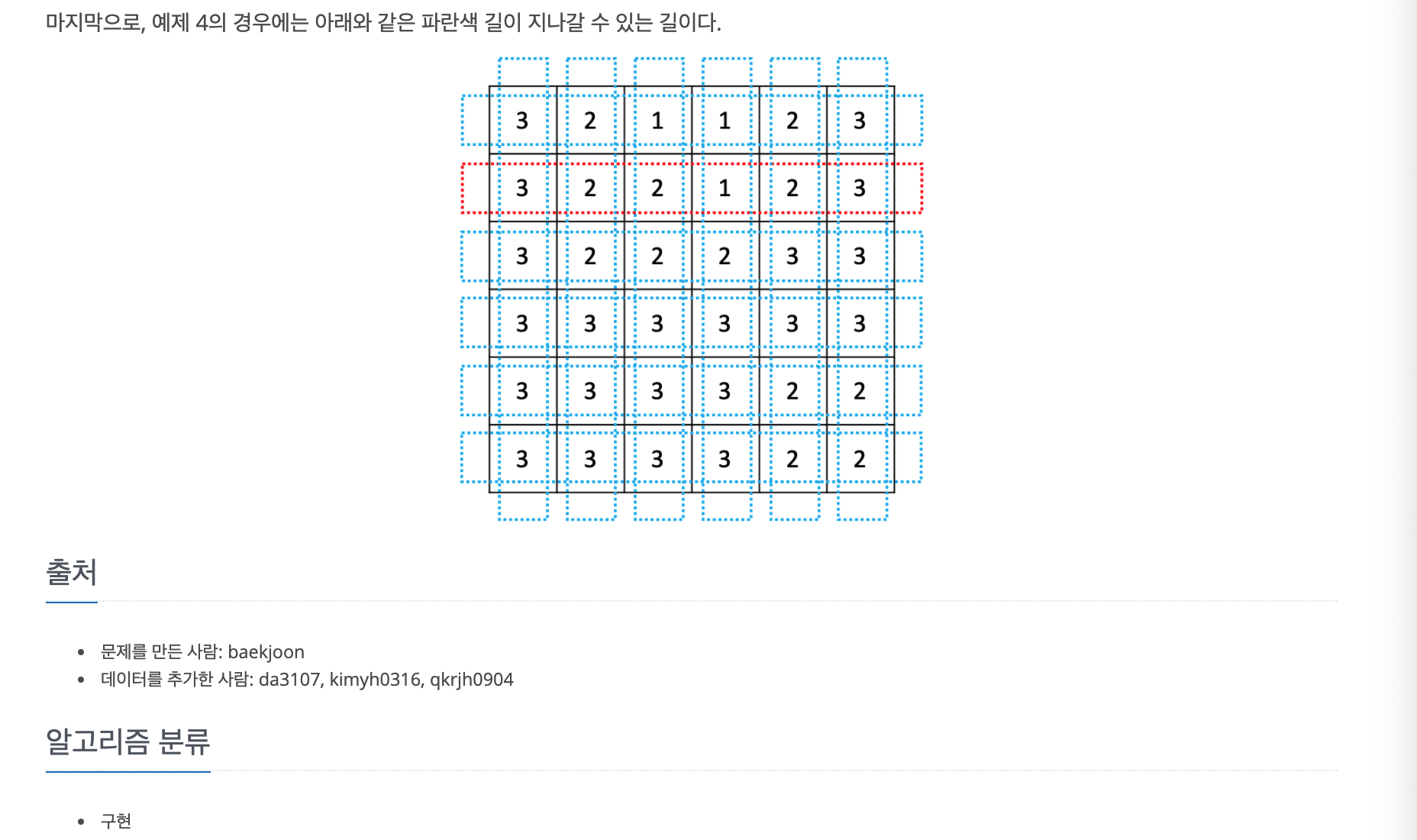 import java.io.BufferedReader; import java.io.InputStreamReader; import java.util.StringTokenizer; public class Main { static int N, L, answer; static int[][] board; static boolean[][] isPlaced; public static void main(String[] args) throws Exception{ BufferedReader br = new BufferedReader(new InputStreamReader(System.in)); StringTokenizer st = new StringTokenizer(br.readLine()); N = Integer.parseInt(st.nextToken()); L = Integer.parseInt(st.nextToken()); board = new int[N][N]; isPlaced = new boolean[N][N]; for(int i = 0; i < N; i++) { st = new StringTokenizer(br.readLine()); for(int j = 0; j < N; j++) { board[i][j] = Integer.parseInt(st.nextToken()); } } // 행 기준 검사 for(int i = 0; i < N; i++) { boolean isPossible = true; for(int j = 0; j < N - 1; j++) { // 경사가 1 차이나는 지점을 만나면 if(Math.abs(board[i][j] - board[i][j + 1]) == 1) { // 좌상향 경사로인 경우 // 경사로를 놓을 수 있는 길이가 부족하거나, if(board[i][j] > board[i][j + 1]) { if(j + L > N - 1) { isPossible = false; continue; } // 그 길이의 블록에 이미 놓아진 경사로가 이미 있거나, 높이가 1 낮은 블록들이 아니라면 불가 for(int k = 1; k <= L; k++) { if(isPlaced[i][j + k] || board[i][j + k] + 1 != board[i][j]) { isPossible = false; break; } } if(isPossible) { for(int k = 1; k <= L; k++) { isPlaced[i][j + k] = true; } } }else { // 우상향 경사로인 경우 if(j - L + 1 < 0) { isPossible = false; continue; } for(int k = 0; k < L; k++) { if(isPlaced[i][j - k] || board[i][j - k] + 1 != board[i][j + 1]) { isPossible = false; break; } } if(isPossible) { for(int k = 0; k < L; k++) { isPlaced[i][j - k] = true; } } } }else if(Math.abs(board[i][j] - board[i][j + 1]) > 1) { isPossible = false; } } // 경사로를 놓을 수 있거나, 모두 높이가 같다면 answer 증가 if(isPossible) { answer++; } } // 경사로 초기화 isPlaced = new boolean[N][N]; // 열 기준 검사 for(int j = 0; j < N; j++) { boolean isPossible = true; for(int i = 0; i < N - 1; i++) { // 경사가 1 차이나는 지점을 만나면 if(Math.abs(board[i][j] - board[i + 1][j]) == 1) { // 경사로를 놓을 수 있는 길이가 부족하거나, if(board[i][j] > board[i + 1][j]) { if(i + L > N - 1) { isPossible = false; continue; } // 그 길이의 블록에 이미 놓아진 경사로가 이미 있거나, 높이가 1 낮은 블록들이 아니라면 불가 for(int k = 1; k <= L; k++) { if(isPlaced[i + k][j] || board[i + k][j] + 1 != board[i][j]) { isPossible = false; break; } } if(isPossible) { for(int k = 1; k <= L; k++) { isPlaced[i + k][j] = true; } } }else { if(i - L + 1 < 0) { isPossible = false; continue; } for(int k = 0; k < L; k++) { if(isPlaced[i - k][j] || board[i - k][j] + 1 != board[i + 1][j]) { isPossible = false; break; } } if(isPossible) { for(int k = 0; k < L; k++) { isPlaced[i - k][j] = true; } } } }else if(Math.abs(board[i][j] - board[i + 1][j]) > 1) { isPossible = false; } } // 경사로를 놓을 수 있거나, 모두 높이가 같다면 answer 증가 if(isPossible) { answer++; } } System.out.println(answer); } // end of main }'Algorithms' 카테고리의 다른 글