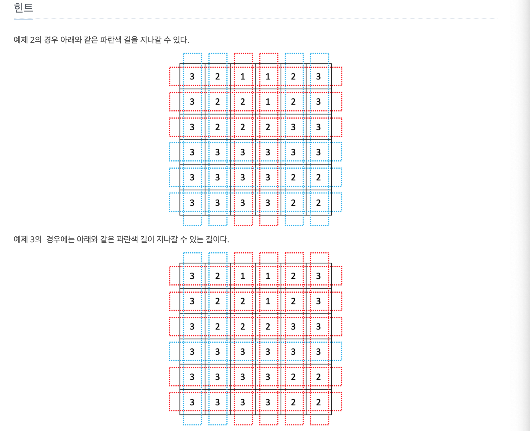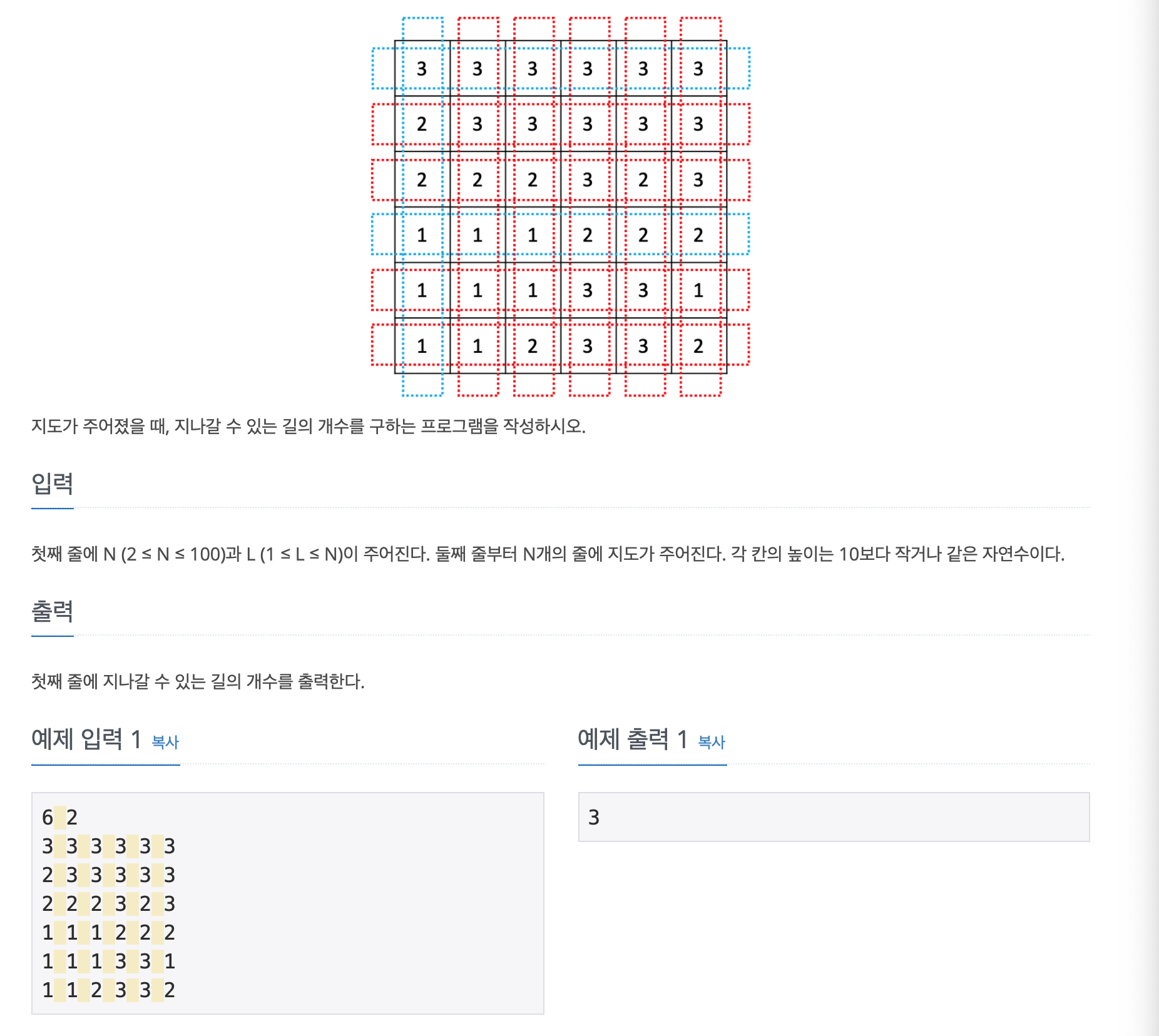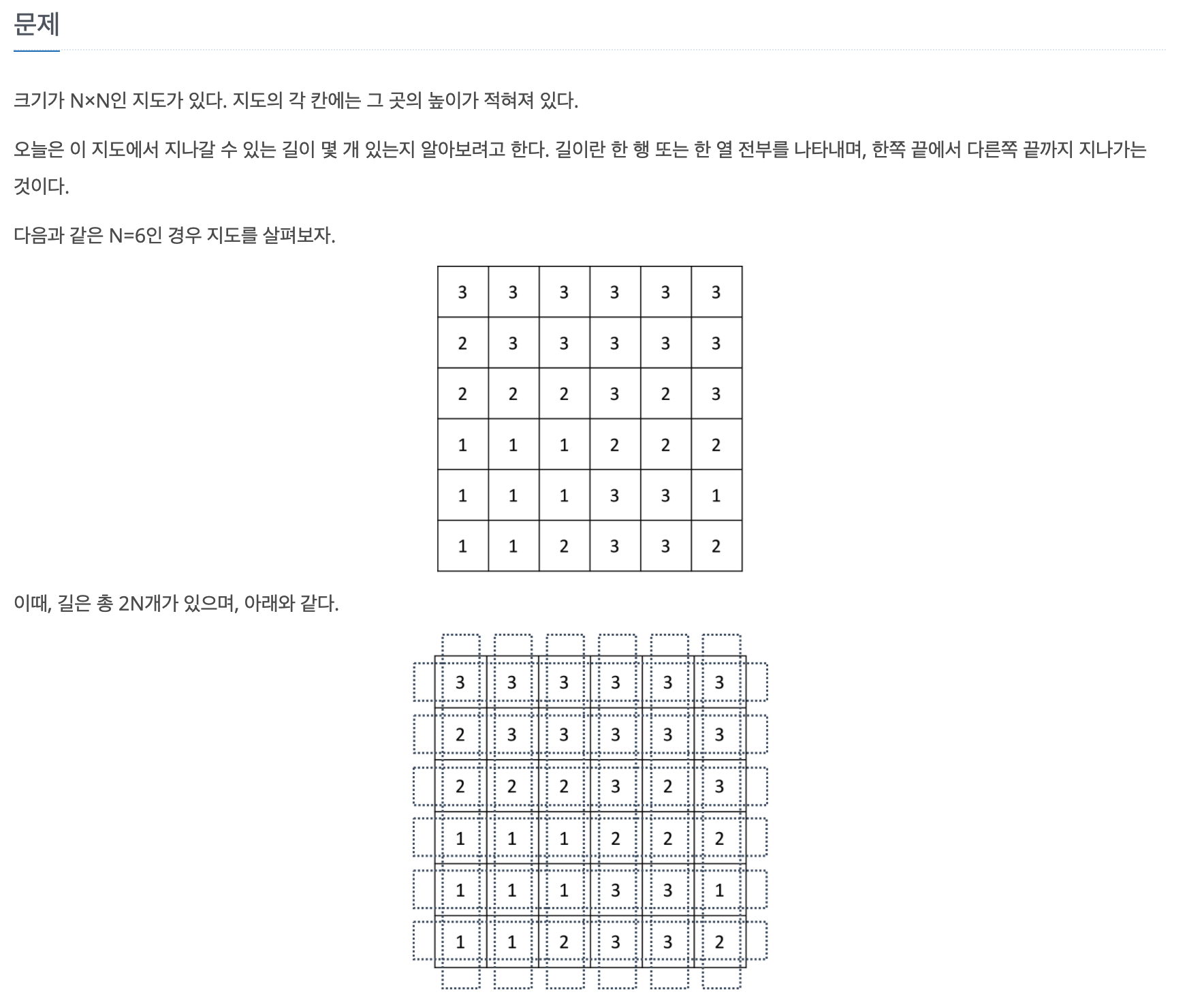 문제에서 길은 행 단위로 N개, 열 단위로 N개 존재해 총 2N개의 길을 검사해야 한다. 따라서 행 단위로 먼저 0행부터 N-1행까지 각 길이 지나갈 수 있는지를 확인하고, 이후 열 단위로 0열부터 N-1열까지 각 길이 지나갈 수 있는지 검사하도록 코드를 작성했다.