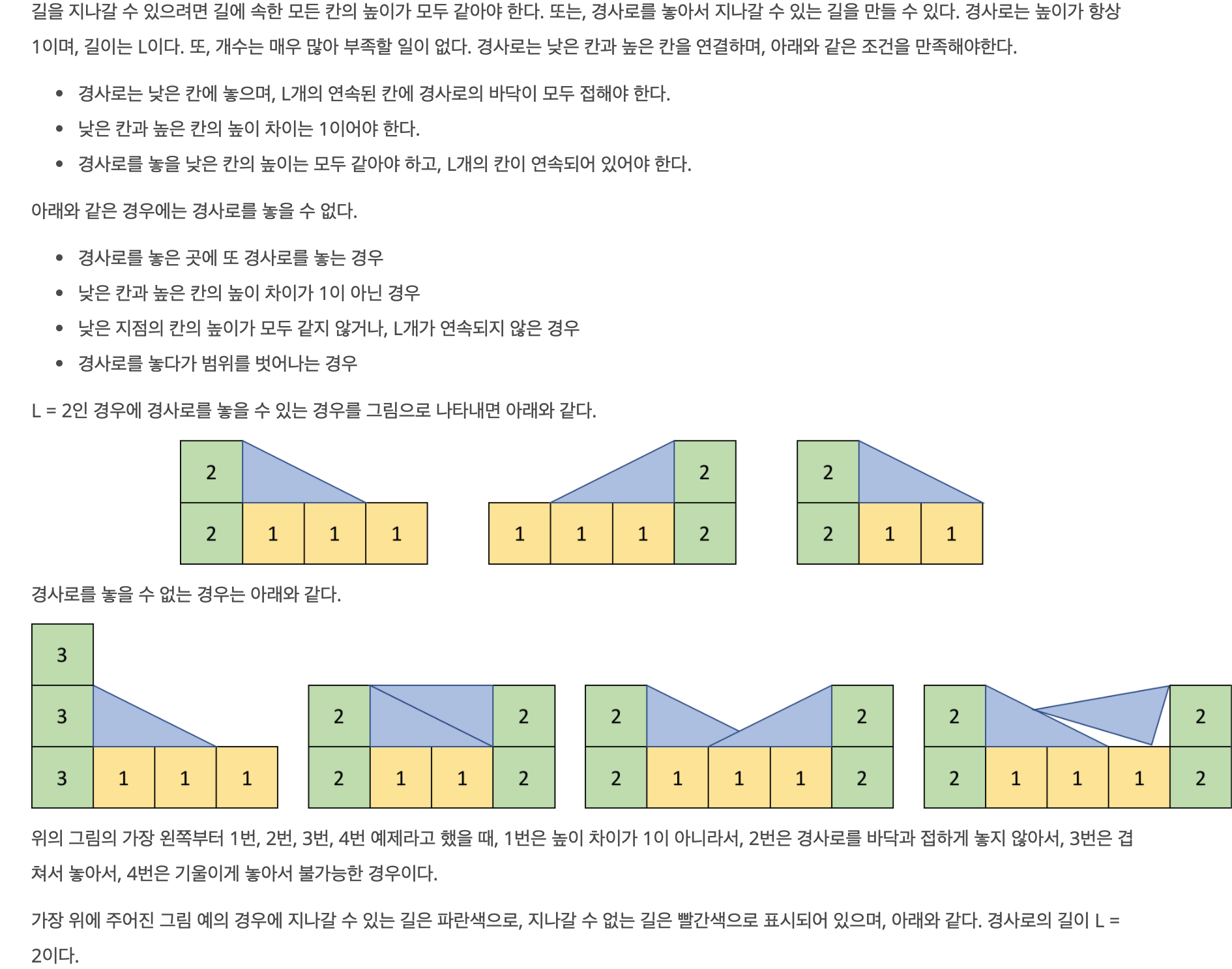 - 만약 오른쪽의 높이가 높다면, 왼쪽에 경사로를 배치한다. 따라서 경사로의 길이 L만큼 놓을 여유가 있는지를 먼저 검사해보고, 여유가 있다면 경사로를 놓는 그 위치들에 이미 놓은 경사로는 없는지, 또 높이가 일정한지를 확인해야 한다.