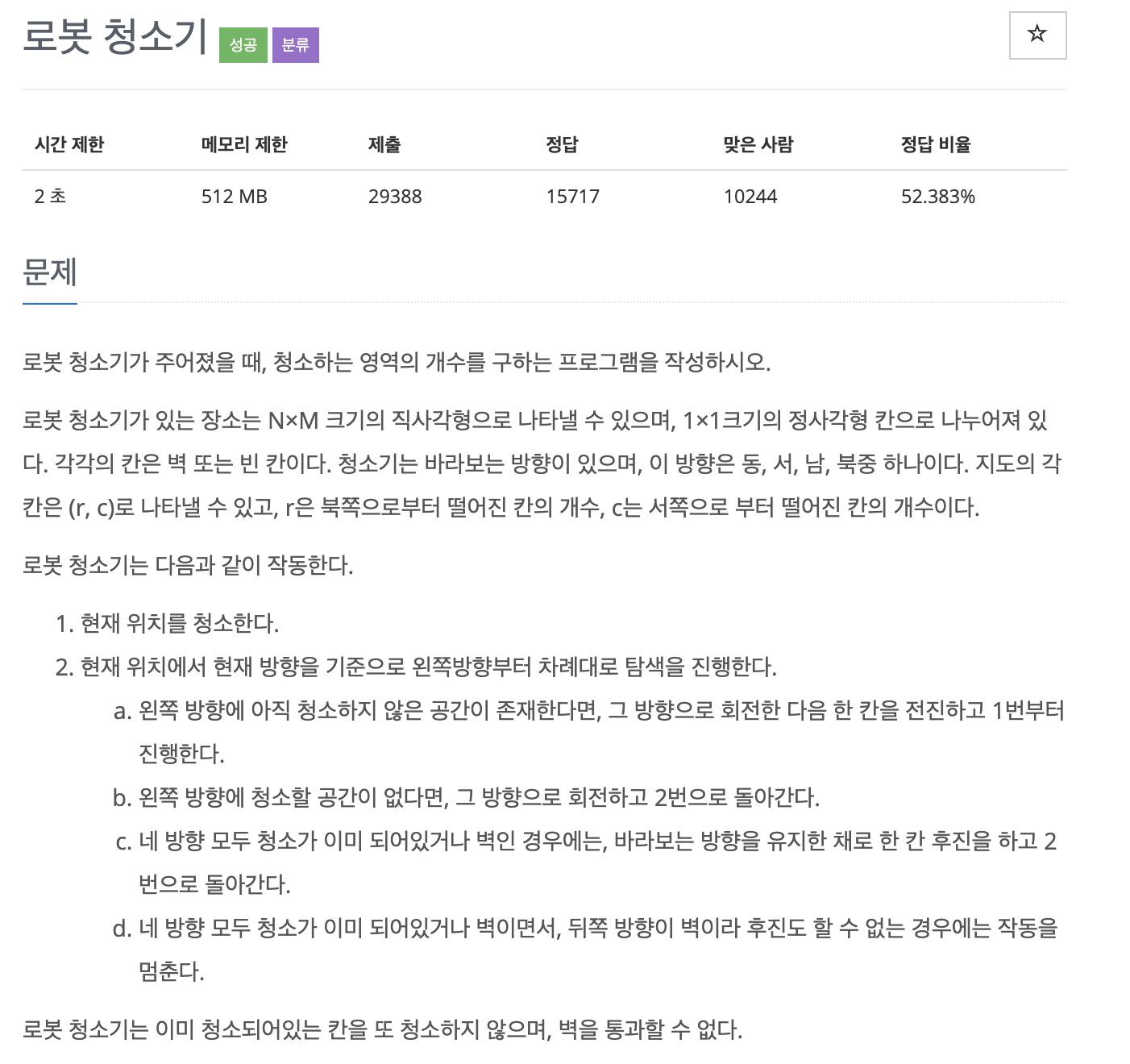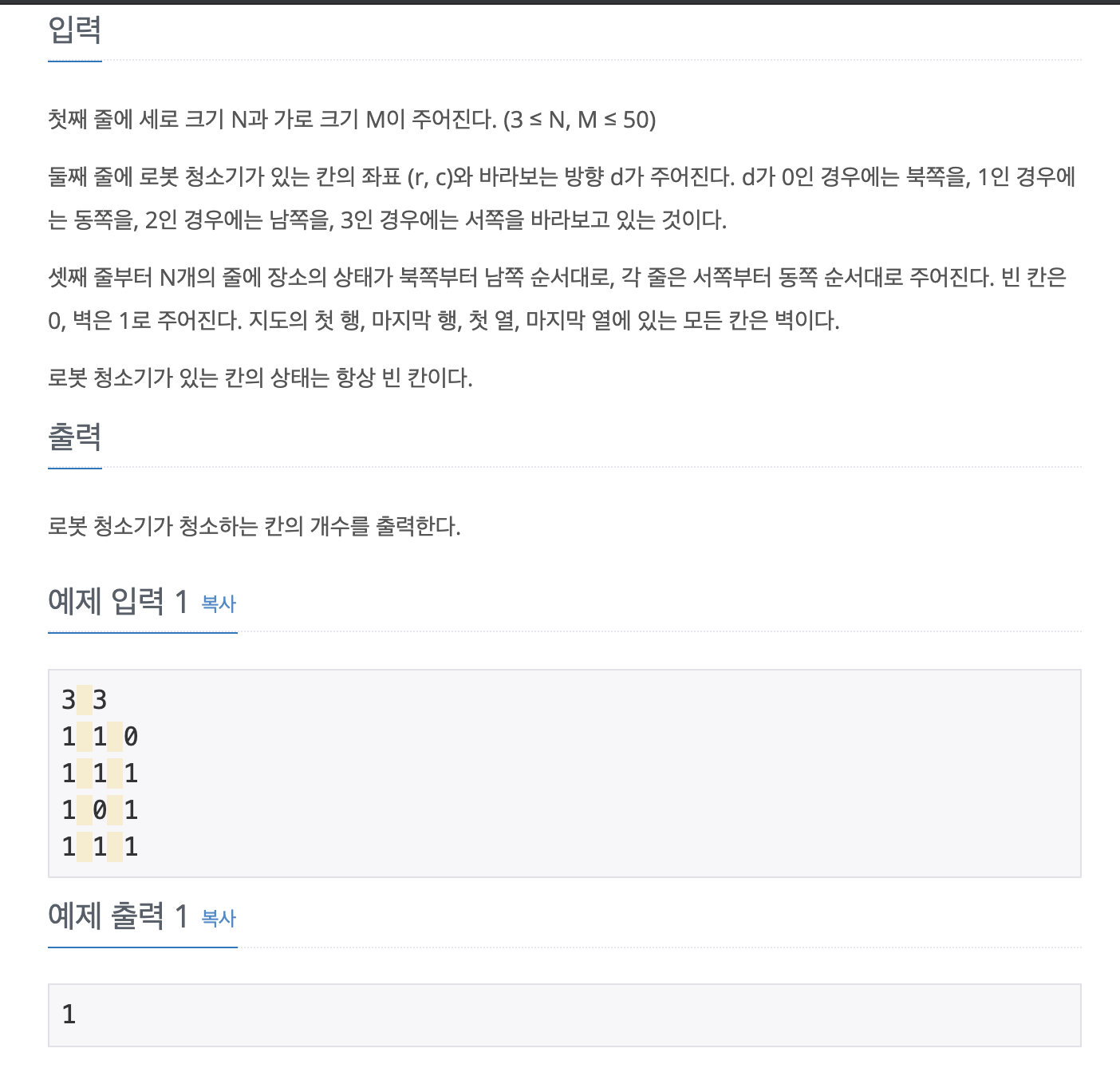 import java.io.BufferedReader; import java.io.InputStreamReader; import java.util.StringTokenizer; public class Main { // 환경 속성 static int N, M; static int room[][]; static boolean isClean[][]; // 청소기 속성 static int direction; static int row, col; static int count = 0; public static void main(String[] args) throws Exception{ BufferedReader br = new BufferedReader(new InputStreamReader(System.in)); StringTokenizer st = new StringTokenizer(br.readLine()); N = Integer.parseInt(st.nextToken()); M = Integer.parseInt(st.nextToken()); room = new int[N][M]; isClean = new boolean[N][M]; st = new StringTokenizer(br.readLine()); row = Integer.parseInt(st.nextToken()); col = Integer.parseInt(st.nextToken()); direction = Integer.parseInt(st.nextToken()); for(int i = 0; i < N; i++) { st = new StringTokenizer(br.readLine()); for(int j = 0; j < M; j++) { room[i][j] = Integer.parseInt(st.nextToken()); } } run(); System.out.println(count); } // 청소기 작동 메서드 static void run() { while(true) { // 1. 현재 위치를 청소 clean(); // 2. 현재 방향 기준 왼쪽 방향부터 탐색 진행 // a) 왼쪽 방향에 청소할 공간 있다면 if(inspectLeft(direction)) { // 회전하고 한 칸 전진후 1번 진행 // 회전 direction -= 1; if(direction == -1) { direction = 3; } // 방향으로 전진 if(direction == 0) { // 북 // 갈 수 있으면 if(row > 1 && room[row-1][col] != 1) row -= 1; }else if(direction == 1) { // 동 if(col < M && room[row][col+1] != 1) col += 1; }else if(direction == 2) { // 남 if(row < N && room[row+1][col] != 1) row += 1; }else { // 서 if(col > 1 && room[row][col-1] != 1) col -= 1; } // System.out.println(100); // System.out.println(direction+", "+row+","+col); // try { // Thread.sleep(300); // } catch (InterruptedException e) { // e.printStackTrace(); // } continue; }else { // c) 네 방향 모두 청소할 공간이 없다면 한 칸 후진 if(!inspectLeft(0) && !inspectLeft(1) && !inspectLeft(2) && !inspectLeft(3)) { if(direction == 0) { // 북 row += 1; // d) 후진이 불가능한 경우 작동을 멈춤 if(row == N || room[row][col] == 1) { break; } }else if(direction == 1) { // 동 col -= 1; // d) 후진이 불가능한 경우 작동을 멈춤 if(col == -1 || room[row][col] == 1) { break; } }else if(direction == 2) { // 남 row -= 1; // d) 후진이 불가능한 경우 작동을 멈춤 if(row == -1 || room[row][col] == 1) { break; } }else { // 서 col += 1; // d) 후진이 불가능한 경우 작동을 멈춤 if(col == M || room[row][col] == 1) { break; } } // System.out.println(101); }else { // b) 왼쪽은 없지만 다른 방향 청소가 가능하면 좌회전하고 2번으로 돌아감 direction -= 1; if(direction == -1) { direction = 3; } // System.out.println(102); // clean 함수가 이미 청소한 칸에서는 횟수를 세지 않도록 동작시키면 1번으로 돌려보내도 됌 continue; } } } } // 왼쪽 방향에 청소할 공간 있는지 확인 static boolean inspectLeft(int dir) { if(dir == 0) { // 북쪽 방향을 바라보는 경우 if(col > 0) { if(room[row][col-1] == 0 && isClean[row][col-1] == false) return true; } // 청소할 공간 없었다면 false 반환 return false; } else if(dir == 1) { // 동쪽 방향을 바라보는 경우 if(row > 0) { if(room[row-1][col] == 0 && isClean[row-1][col] == false) return true; } // 청소할 공간 없었다면 false 반환 return false; } else if(dir == 2) { // 남쪽 방향을 바라보는 경우 if(col < M - 1) { if(room[row][col+1] == 0 && isClean[row][col+1] == false) return true; } // 청소할 공간 없었다면 false 반환 return false; } else { // 서쪽 방향을 바라보는 경우 if(row < N - 1) { if(room[row+1][col] == 0 && isClean[row+1][col] == false) return true; } // 청소할 공간 없었다면 false 반환 return false; } } // 청소 시행 및 횟수 카운트 메서드 static void clean() { if(isClean[row][col] == false && room[row][col] == 0) { // System.out.println(row+", "+col + ": 청소 완료"); isClean[row][col] = true; count++; } } }'Algorithms' 카테고리의 다른 글