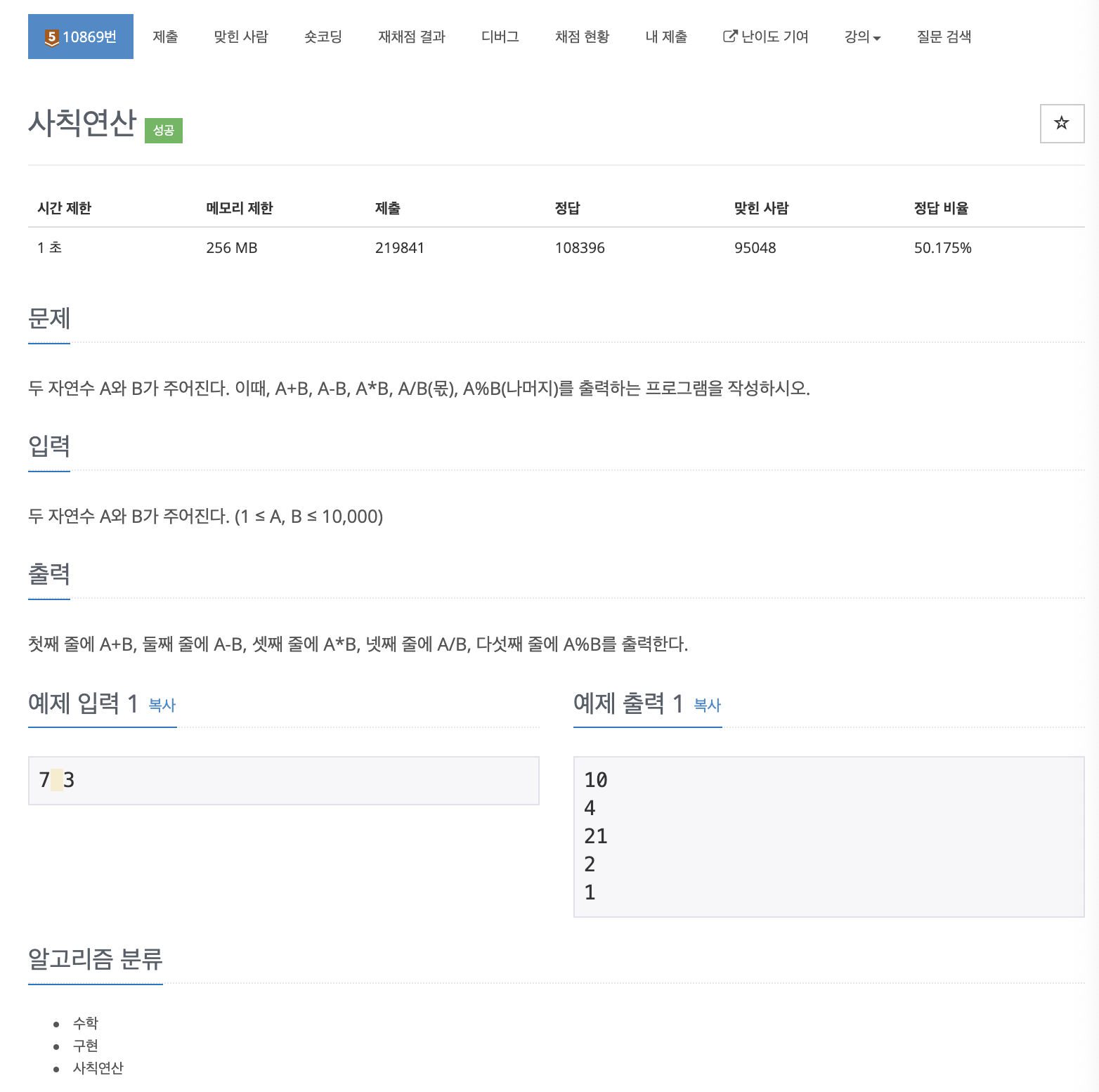 package main import ( "fmt" ) func main() { var a, b int fmt.Scanln(&a, &b) fmt.Println(a + b) fmt.Println(a - b) fmt.Println(a * b) fmt.Println(a / b) fmt.Println(a % b) }간단한 문제이지만 여기서 확인할만한 점은 golang의 int 자료형의 범위, fmt.scanln 함수 정도일 것 같다.