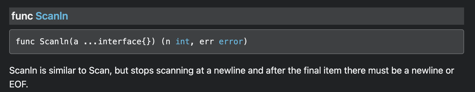 설명에 잘 나와있듯 Scan 함수와 유사하면서 개행문자를 만났을 때, 마지막 item 이후의 개행 혹은 EOF(End of File)일 때 Scan을 멈춘다.