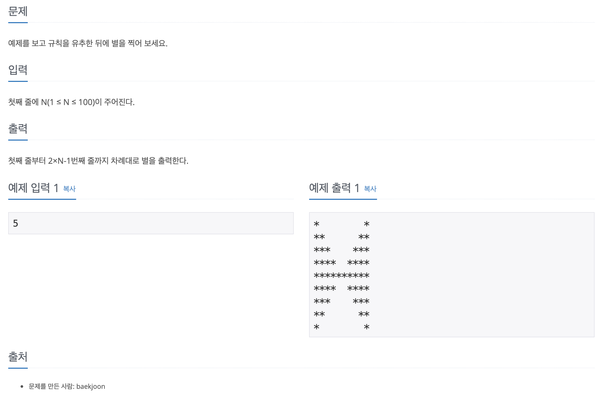 1234567891011121314151617181920212223242526272829303132333435363738394041424344454647484950package io;public class N2445 {public static void main(String[] args) {Scanner sc = new Scanner(System.in);int n =sc.nextInt();for(int p =0; p<n; p++) {for(int q = 0; q<p+1; q++) {System.out.print("*");}for(int q = 0; q<n-p-1; q++) {System.out.print(" ");}for(int q = 0; q<n-p-1; q++) {System.out.print(" ");}for(int q = 0; q<p+1; q++) {System.out.print("*");}System.out.println();}for(int p =1; p<n; p++) {for(int q = 0; q<n-p; q++) {System.out.print("*");}for(int q = 0; q<p; q++) {System.out.print(" ");}for(int q = 0; q<p; q++) {System.out.print(" ");}for(int q = 0; q<n-p; q++) {System.out.print("*");}System.out.println();}}}예제 출력 부분을 보고 4면으로 나눠 생각했습니다.