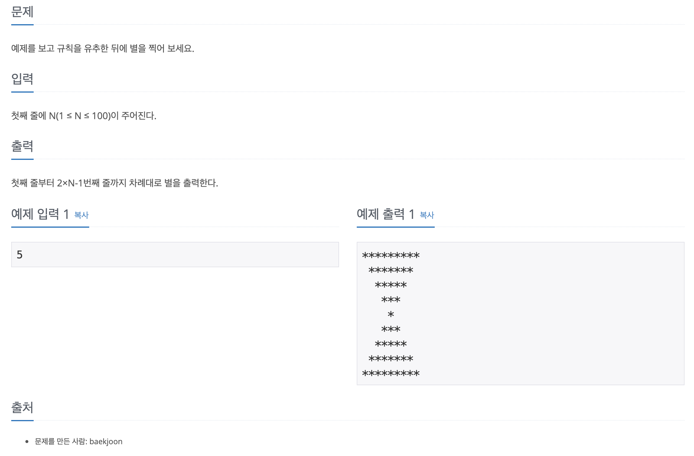 1234567891011121314151617181920212223242526272829303132333435363738package io;public class N2446 {public static void main(String[] args) {Scanner sc = new Scanner(System.in);int n = sc.nextInt();for(int p = 0; p<n; p++) {for(int q=0; q<p;q++) {System.out.print(" ");}for(int q=0; q<2*(n-p)-1;q++) {System.out.print("*");}System.out.println("");}for(int p = 1; p<n; p++) {for(int q=0; q<n-p-1;q++) {System.out.print(" ");}for(int q=0; q<2*p+1;q++) {System.out.print("*");}System.out.println("");}}}Github: https://github.com/jaeuk9407/AlgorithmBOJ