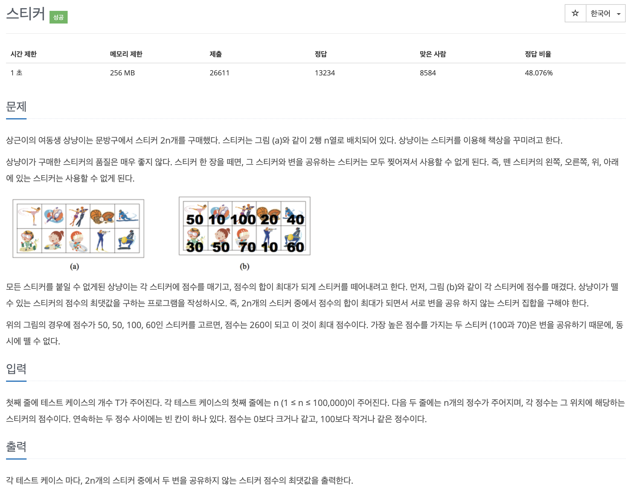 123456789101112131415161718192021222324252627282930313233343536373839404142434445464748495051525354555657585960package dp;public class N9465 {static long data[][];static long d[][];public static void main(String[] args) {Scanner sc = new Scanner(System.in);int testn = sc.nextInt();int n;for(int i=0; i<testn; i++) {n= sc.nextInt();long data1[] = new long[n];long data2[] = new long[n];data = new long[2][n+1];for(int j=0; j<n;j++) {data1[j] = sc.nextLong();}for(int j=0; j<n;j++) {data2[j] = sc.nextLong();}for(int j=0; j<n;j++) {data[0][j] = data1[j];data[1][j] = data2[j];}System.out.println(bottomUp(n));}}public static long bottomUp(int n) {long d[][] = new long[3][n+1];d[0][0] = 0;d[1][0] = data[0][0];d[2][0] = data[1][0];for(int i=1; i<=n; i++) {}return ans;}}Colored by Color Scripterd[i][j] :