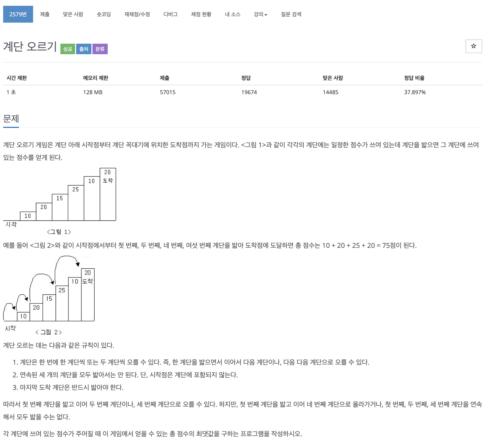백준 알고리즘 2579번 요즘 한동안 DP문제에 손을 못대고, 최근 파이썬을 공부하게 되면서 오랜만에 풀다보니 감이 많이 떨어졌다. 문제 접근까지는 비슷하게 갔는데, 마지막 계단을 반드시 밟는다는 조건을 못 풀고 있었다. 다른 분의 풀이를 참고해보니 역순으로 접근하면 되는 것... 이전에도 유사한 문제가 있었는데 내가 아예 까먹은 것 같다..ㅠㅠ