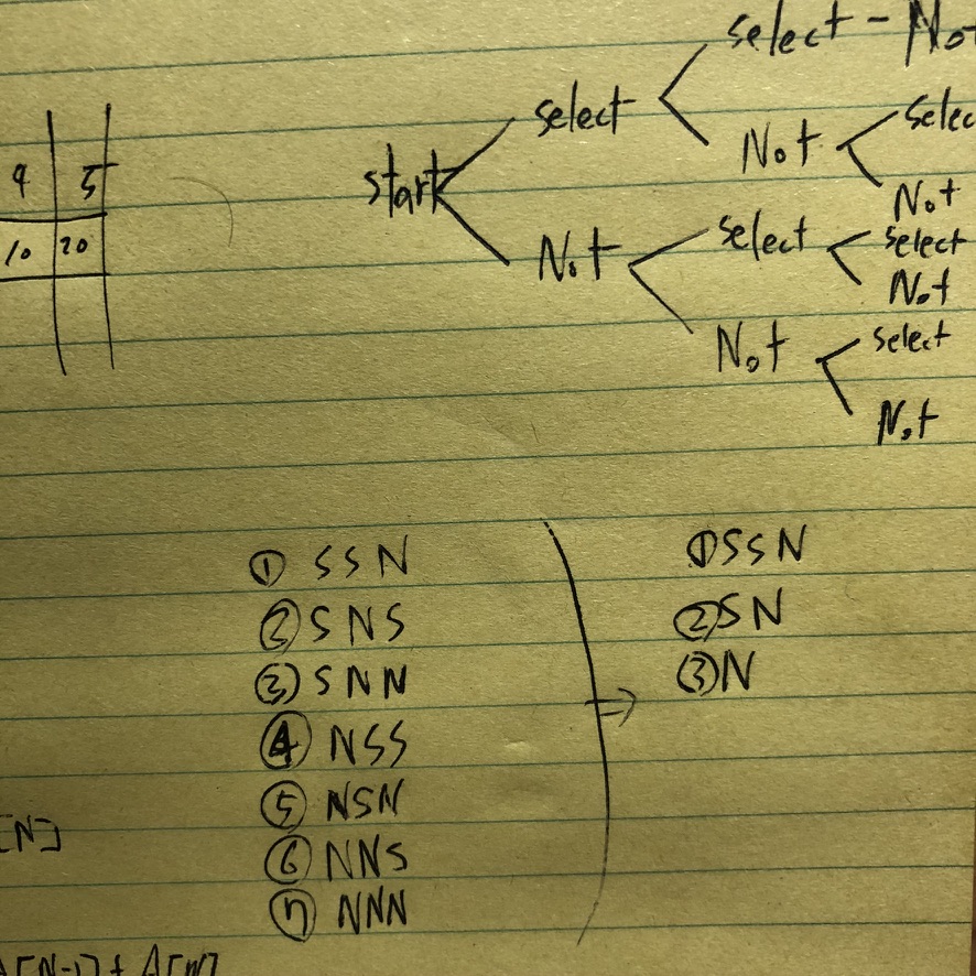 처음에는 시작하는 위치에서 증가하는 방향으로 행동을 Select, Not 2개로 정의한 뒤, 경우의 수를 쭉 나열해보고 Not select를 하는 순간부터 연속 select 조건이 사라지므로 SSN, SN, N으로 세 가지로 추려냈다. 그리고 조건 중 마지막 계단을 반드시 밟는 다는 조건에서 헤매다가 결국 다른 분의 풀이를 참고했다.