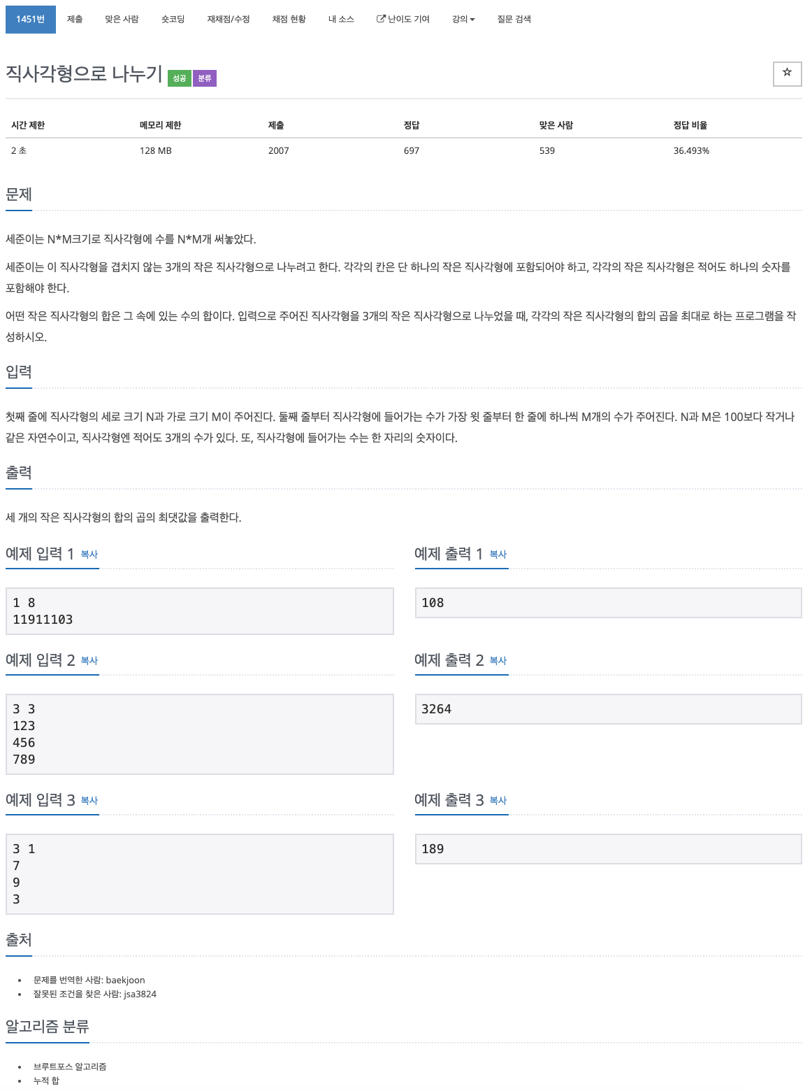 백준 알고리즘 1451번 처음 문제를 접근했을 때, '직사각형의 합의 곱을 최대로'에 주목해 삽질을 좀 하다가 영 답이 나오지 않았는데, 저지 운영자인 백준님이 직접 올려주신 풀이를 발견했다.