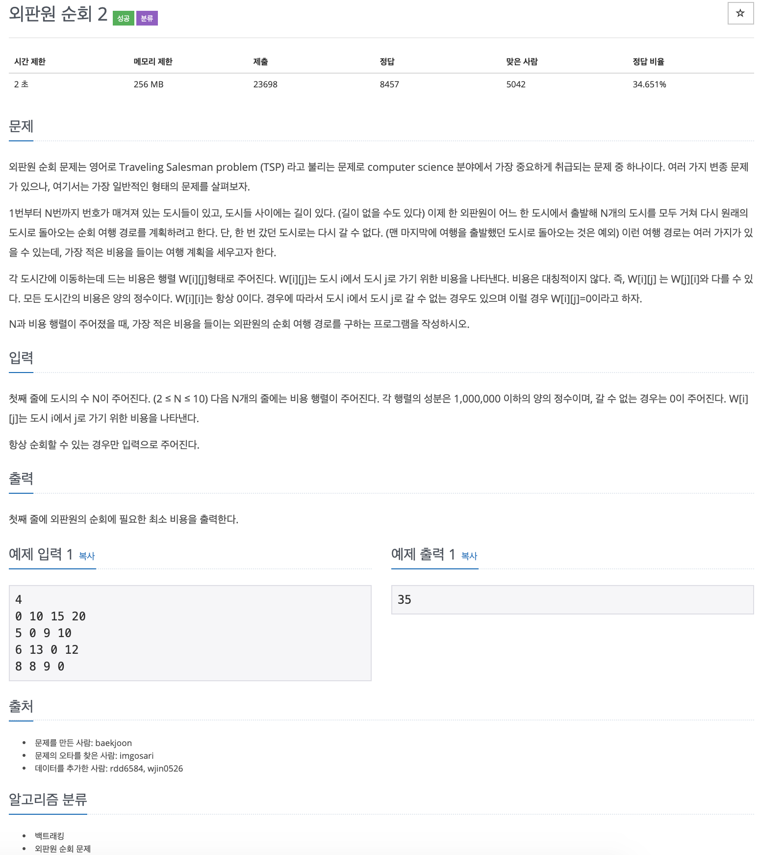 백준 알고리즘 10971번 사실 이 문제는 더이상 완전 탐색으로 풀리지 않는 것 같다. 처음에 순열을 이용한 완전탐색을 시도했다가 시간초과가 나와서 2020년 3월에 작성된 다른 분의 DFS 풀이로 다시 한 번 풀었는데 이 코드도 시간초과를 받았다. 결국 또 다른 분의 비트마스크를 활용한 풀이를 참조해 성공 결과를 받을 수 있었다.