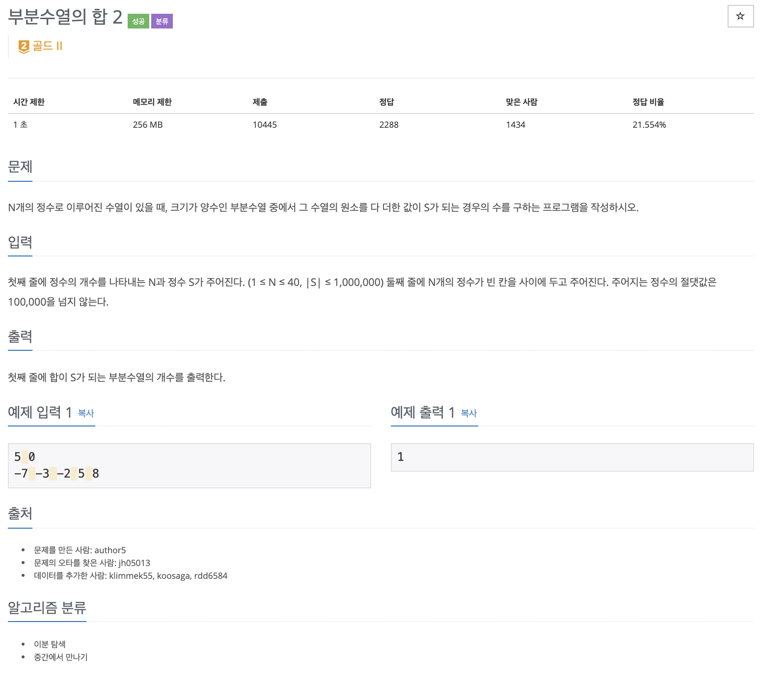 BOJ 1208번 부분수열의 합2 이전에 풀었던 1182번 부분수열의 합 문제와 유사한데, 이번엔 수열 길이의 범위가 40으로 늘어났다. 이전처럼 백트래킹으로 구현하면 주어진 시간 내에 해결할 수가 없다.(2^40 = 약 1조)