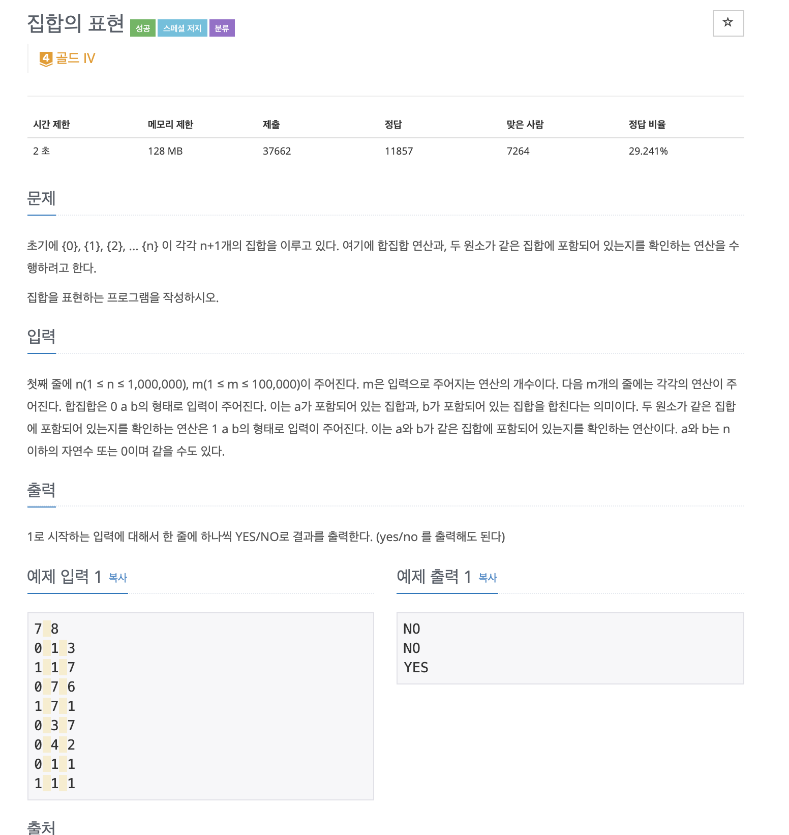 BOJ 1717 집합의 표현 그래프 이론 중 Union & Find 개념을 알고 있다면 쉽게 접근할 수 있는 문제다. 합집합 연산에서는 Union, 같은 집합에 포함되어 있는지 확인 연산은 Find로 확인할 수 있다.