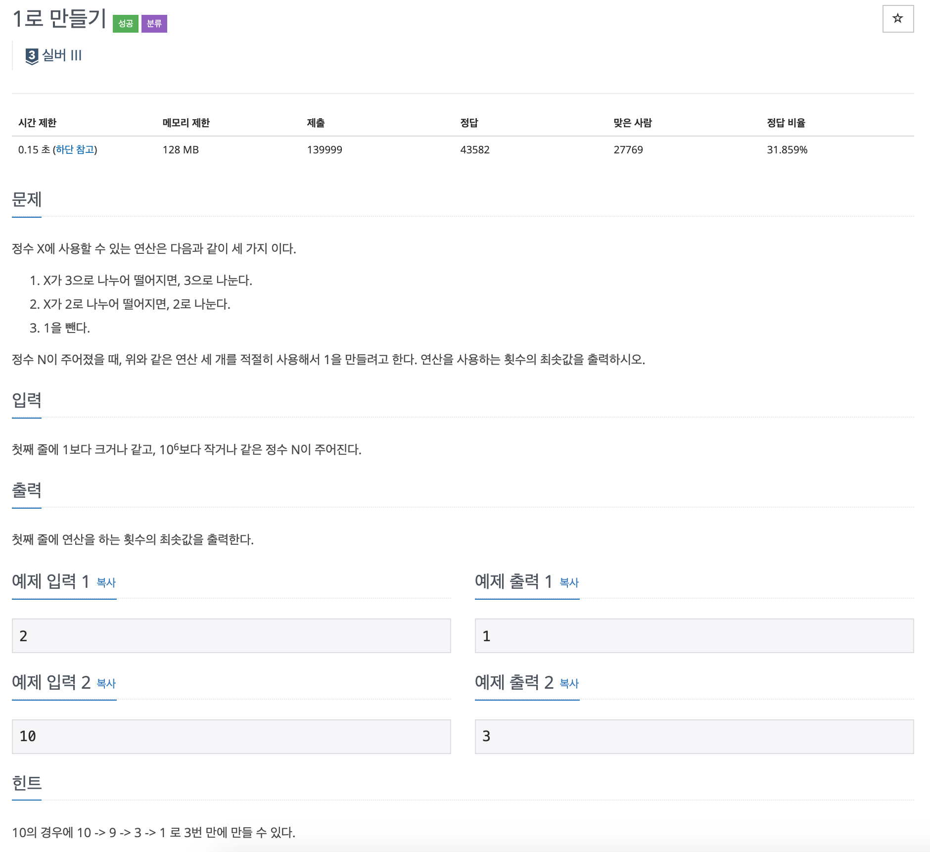 import java.io.BufferedReader; import java.io.InputStreamReader; public class IncorrectAnswer { static int N; public static void main(String[] args) throws Exception{ BufferedReader br = new BufferedReader(new InputStreamReader(System.in)); N = Integer.parseInt(br.readLine()); dp = new int[N + 1]; int ans = solve(N, 0); System.out.println(ans); } private static int solve(int num, int cnt) { // 도착지 -> 현재까지의 count 반환 if(num == 1) { return cnt; } // 가장 많이 탐색해도 N을 넘어가지 않음 int result1 = N+1; int result2 = N+1; int result3 = N+1; // 1, 2, 3번 선택한 결과의 최선 결과를 저장 if(num % 3 == 0) { result1 = solve(num/3, cnt+1); } if(num % 2 == 0) { result2 = solve(num/2, cnt+1); } result3 = solve(num-1, cnt+1); // 각 결과값을 비교해 그 중에서의 최솟값 선택하고 저장 int min = Math.min(result1, Math.min(result2, result3)); // 현재 위치에서의 최솟값을 반환 return min; } }예제 입력에 대한 출력은 정확하게 반환하지만 제출해보니 역시 시간 초과 결과를 받았다. solve 함수가 1번 연산, 2번 연산, 3번 연산을 수행하는 각각의 경우(result1, result2, result3)에 대해 재귀적으로 탐색하고, 최소 결과를 return 하는 구조로 작성했다.