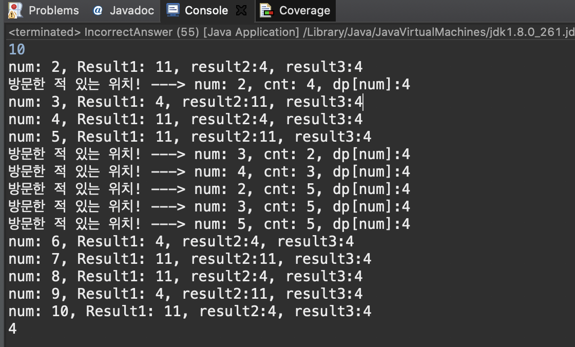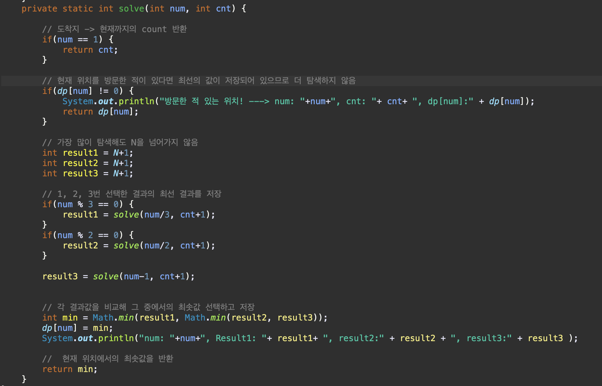 import java.io.BufferedReader; import java.io.InputStreamReader; public class IncorrectAnswer { static int N; static int dp[]; public static void main(String[] args) throws Exception{ BufferedReader br = new BufferedReader(new InputStreamReader(System.in)); N = Integer.parseInt(br.readLine()); dp = new int[N + 1]; int ans = solve(N, 0); System.out.println(ans); } private static int solve(int num, int cnt) { // 도착지 -> 현재까지의 count 반환 if(num == 1) { return cnt; } // 현재 위치를 방문한 적이 있다면 최선의 값이 저장되어 있으므로 더 탐색하지 않음 if(dp[num] != 0) { return dp[num]; } // 가장 많이 탐색해도 N을 넘어가지 않음 int result1 = N+1; int result2 = N+1; int result3 = N+1; // 1, 2, 3번 선택한 결과의 최선 결과를 저장 if(num % 3 == 0) { result1 = solve(num/3, cnt+1); } if(num % 2 == 0) { result2 = solve(num/2, cnt+1); } result3 = solve(num-1, cnt+1); // 각 결과값을 비교해 그 중에서의 최솟값 선택하고 저장 int min = Math.min(result1, Math.min(result2, result3)); dp[num] = min; // 현재 위치에서의 최솟값을 반환 return min; } }작성은 쉽게 했는데, 어찌된 영문인지 예제 입력2를 통과하지 못하고 4라는 출력을 보게 됐다. 그래서 solve문 내에 아래와 같은 테스트용 출력 코드를 추가해서 돌려봤다.