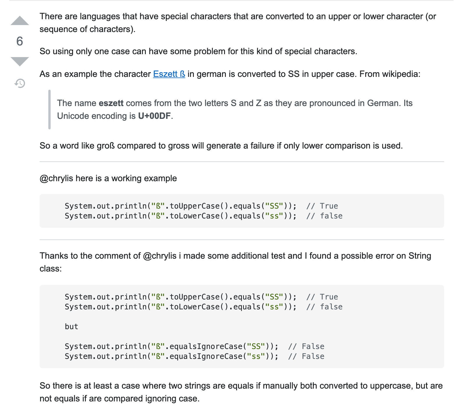 stackoverflow 캡처 상상도 못했는데, 일반적으로 알고 있는 영문 알파벳들 사이에 존재하는 다국어 유니코드가 있다고 한다. 이 때문에 toUpperCase()메서드로 검사했을 때는 true를 반환하는데 toLowerCase()로 검사했을 땐 false를 반환하는 경우가 존재하는 것이다. 또, 반대의 경우도 물론 존재한다.