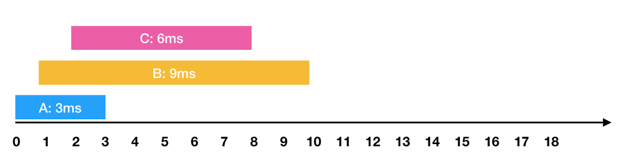 - A: 3ms 시점에 작업 완료 (요청에서 종료까지 : 3ms) - B: 1ms부터 대기하다가, 3ms 시점에 작업을 시작해서 12ms 시점에 작업 완료(요청에서 종료까지 : 11ms) - C: 2ms부터 대기하다가, 12ms 시점에 작업을 시작해서 18ms 시점에 작업 완료(요청에서 종료까지 : 16ms)
